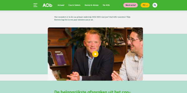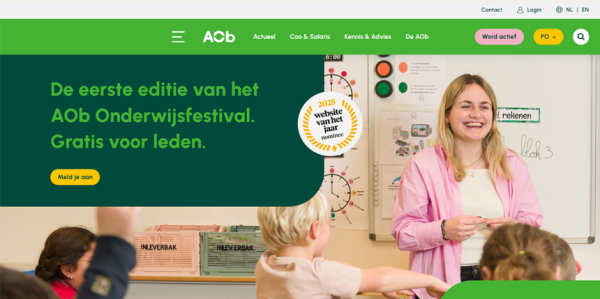 Ook leuk: de AOb website is genomineerd voor ‘Website van het Jaar 2025’ in de categorie 'belangenorganisatie', dit is één van de 39 categorieën van de publieksprijs voor de beste en populairste websites in Nederland.